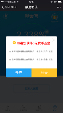 3.新用户需要先开户,老用户直接登录,领取后货币基金不是立即到账的,需要等。到时基金份额确认到现金宝里了,再点击菜单栏“我要交易”-“现金宝取现”提到银行卡里。