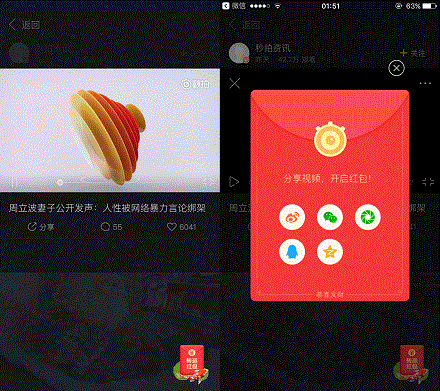 4.点击秒拍的首页,随便打开一个热门视频播放,点击右下角的红包图标,随便分享到一个平台,记得返回后可获得1个红包。