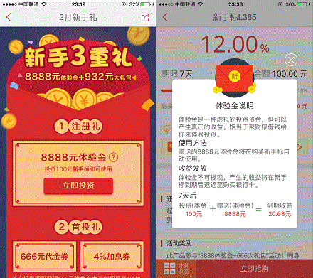 聚财猫是本站推荐很多次的平台了,其中有一个新用户的活动一直在进行,可能有些人还没注意到,今天我再次推荐下。用户注册赠送8888元体验金,投资100元新手标可使用,预计7天可产生20.68元利息,到期后自动返还到银行!