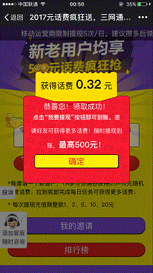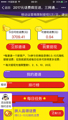 不知道是套路,还是我运气背,我做完只有0.94元,如果你和我一样没到1元,只有等第二天再做任务。或者邀请好友,每邀请一个好友0.5-10元随机话费!