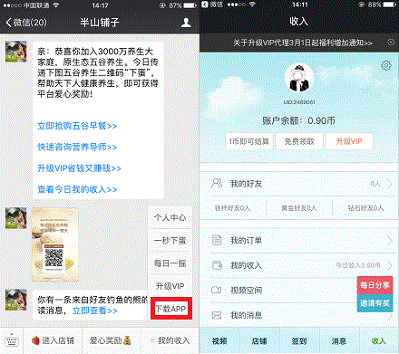 2.关注后,点击右下角菜单栏“我的收入”-“下载app”,安装后用微信登录可看到已有0.9元余额。