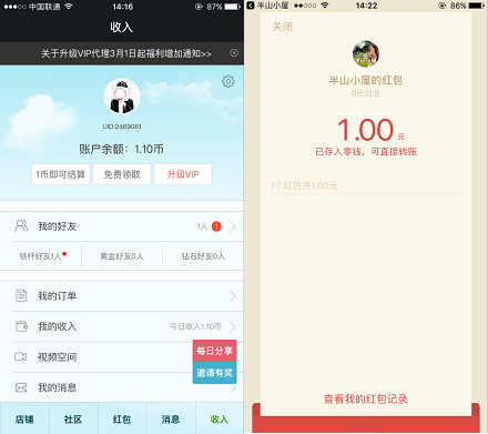 半山小屋类似之前推荐的深山果农,关注微信后下载app后可免费获得0.9元,同时获得一个二维码,随便发给一个好友或者用自己微信小号扫描关注下即可再获得0.2元,加起来就是1.1元,可直接提现1元微信红包,秒到账!