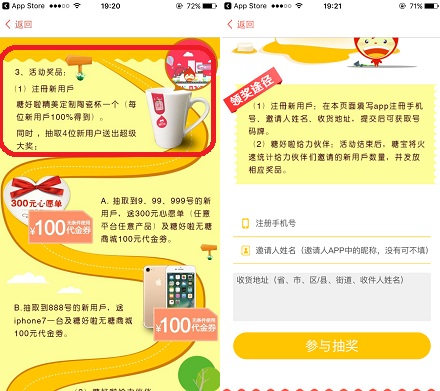 糖好啦是一个糖尿病专科个人健康管理平台,当然也不是非得要有糖尿病才能使用这个平台,健康的人依然可以注册。活动期间,新用户注册后可100%免费获得糖好啦精美定制陶瓷杯一个,据说是包邮送到家的!邀请好友可以获得更多奖品!