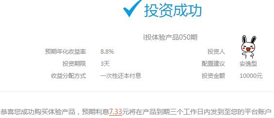 中民i投是中民未来控股集团有限公司旗下的线上理财平台,有兴趣的可以自己百度下,背景看起来很强大的样子。目前新用户注册可免费获得10000元体验金,投体验标3天后,预计可产生7.33元利息,已经有人成功提现到账了,无手续费!