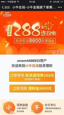 小牛在线是深圳市小牛在线互联网信息咨询有限公司旗下理财平台,目前联合k米(很多ktv都用的这个系统)针对小牛在线的新用户,免费注册绑卡后可获得5元话费!另外注册后还赠送一些投资返现券和体验金,需要投资才能使用。