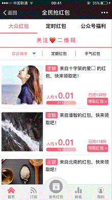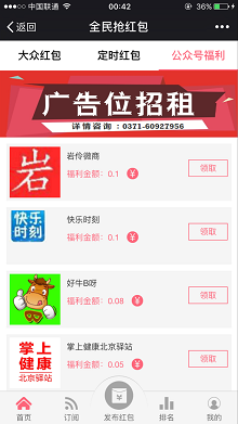 2.点击菜单栏“领取红包”进入后,可看到有“大众红包”“定时红包”“公众号福利”
