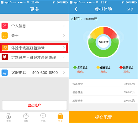 3.登录后,点击“更多”-“体验来钱赢红包游戏”进入后,会免费赠送10000元体验金,随便配置并提交后,按提示一直随便点。