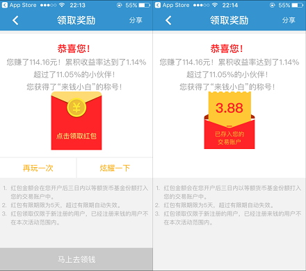 来钱是嘉实基金打造的集理财与社交于一体的手机app,目前新老用户登录后可获得10000元虚拟体验金,免费体验后可获得3.88元红包,3个工作日内以等额货币基金份额到账,大家都懂的,可以直接赎回到银行卡的!