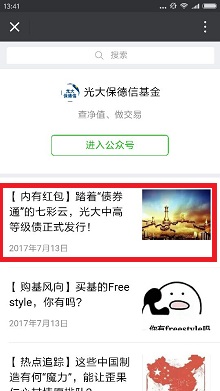 1.打开微信搜索“光大保德信基金”(微信号:EPF-4008202888),关注后,查看历史消息。