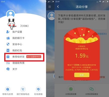 多年前本站推荐过e钱包,是易方达基金旗下的产品,看来举办活动并不太多。目前新老用户下载e钱包app后,分享到朋友圈或者微信好友,即可免费领取1-999元红包,以货币基金形式到账,可直接提现到银行卡!