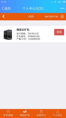 3.客服在线的时候,一般1小时内通过认证。认证后,在“我的矿机”可以看到有一台“微型云矿机”。